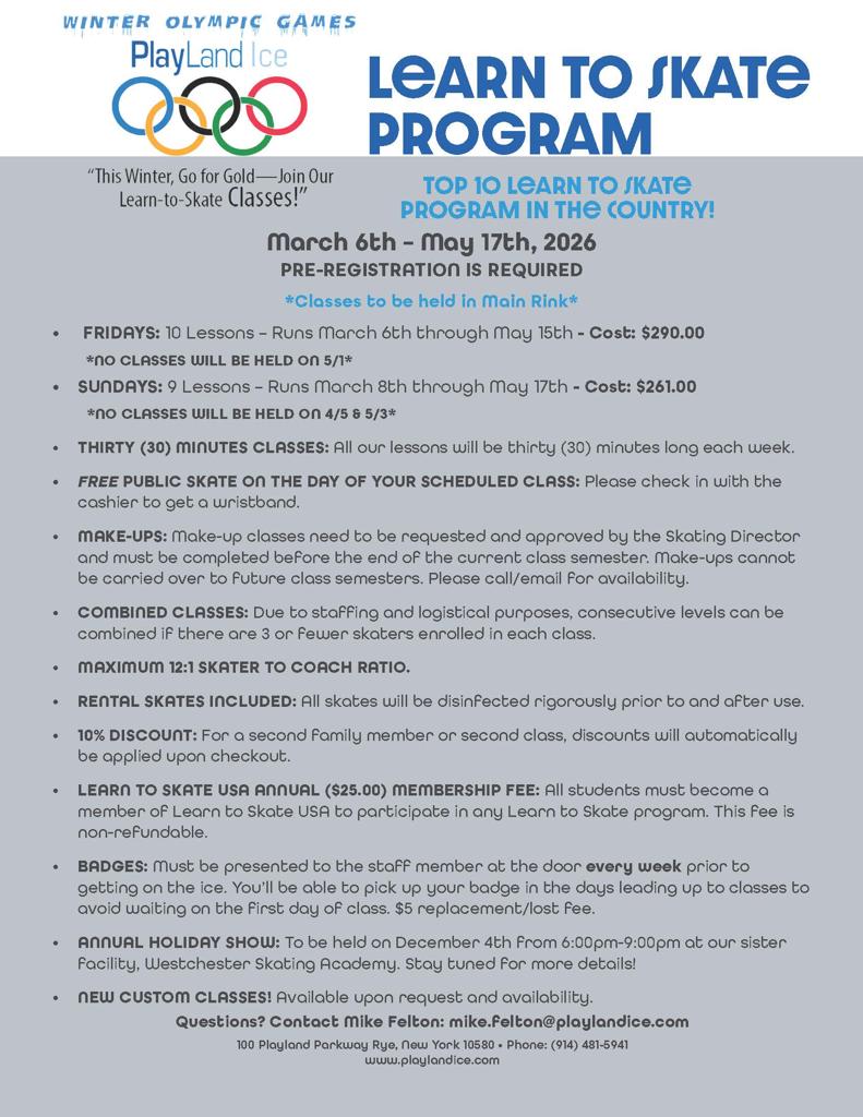 PlayLand Ice offers Learn to Skate and Learn to Play Hockey classes throughout the entire year. We follow the Learn to Skate USA program made by U.S. Figure Skating, which offers something for everyone, from the first steps on the ice to mastering advanced techniques. Skaters will learn the ABC’S of basic athleticism - Agility, Balance, Coordination and Speed. We strive to develop skaters so that they can confidently advance to more specialized areas of skating, or enjoy recreationally skating even more! Our mission is to provide a FUN and positive experience that will instill a lifelong love of skating at PlayLand Ice!