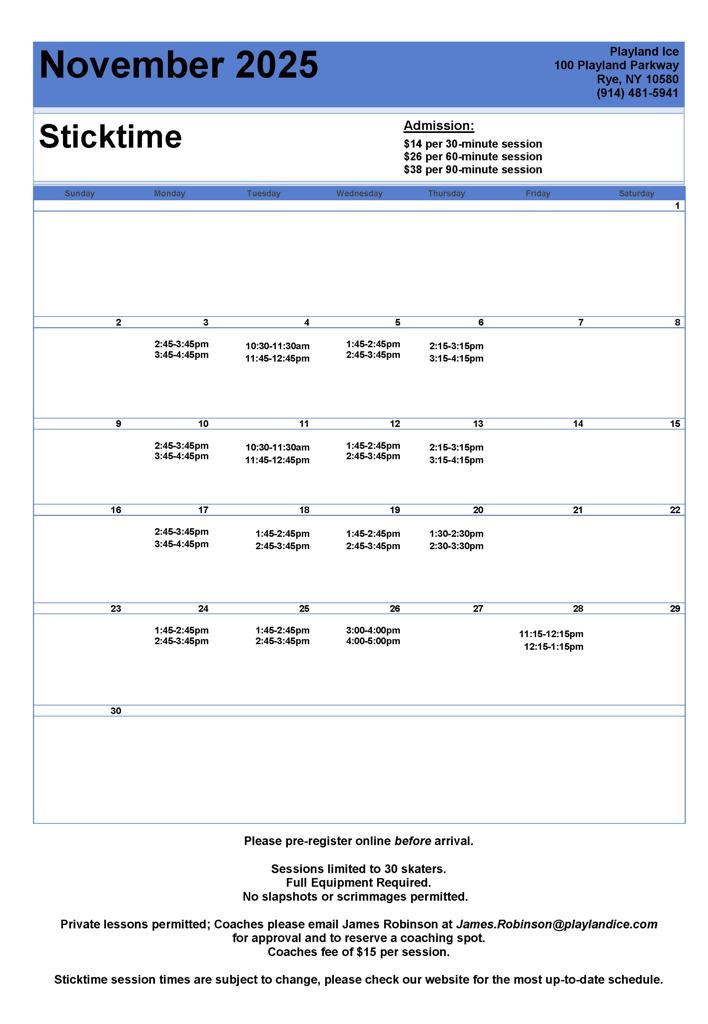 *IMPROVE YOUR HOCKEY SKILLS *PRIVATE LESSONS AVAILABLE WITH PLAYLAND ON-STAFF COACHES ONLY. LESSONS MUST BE BOOKED IN ADVANCE. IF YOU WOULD LIKE TO BECOME A STAFF COACH PLEASE CONTACT MIKE FELTON AT MIKE.FELTON@PLAYLANDICE.COM. *FULL EQUIPMENT REQUIRED. *BRING YOUR OWN PUCK *NUMBER OF SKATERS LIMITED *FIRST COME, FIRST SERVE **SORRY NO SCRIMMAGES OR SLAPSHOTS* *SESSION TIMES CANNOT BE ADJUSTED TO ACCOMMODATE PRIVATE LESSONS, NO SPLITTING/PRORATING OF SESSIONS ALLOWED. FULL PAYMENT IS REQUIRED PRIOR TO TAKING THE ICE FOR EACH SESSION AND WILL BE MONITORED BY A PLAYLAND STAFF MEMBER.*